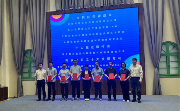 在1865兵工學堂舉行的南京市低空經濟制造業職工科技創新交流大會上,市總工會郁忠副主席、省機冶石化工會張旭海主任為獲得2023年度南京市職工“十大科技創新成果”“十大先進操作法”“十大發明專利”認定的7名職工頒獎,他們手捧“南京市技術能手”榮譽證書熠熠閃光,激勵著全場來自一線的百名產業工人。
