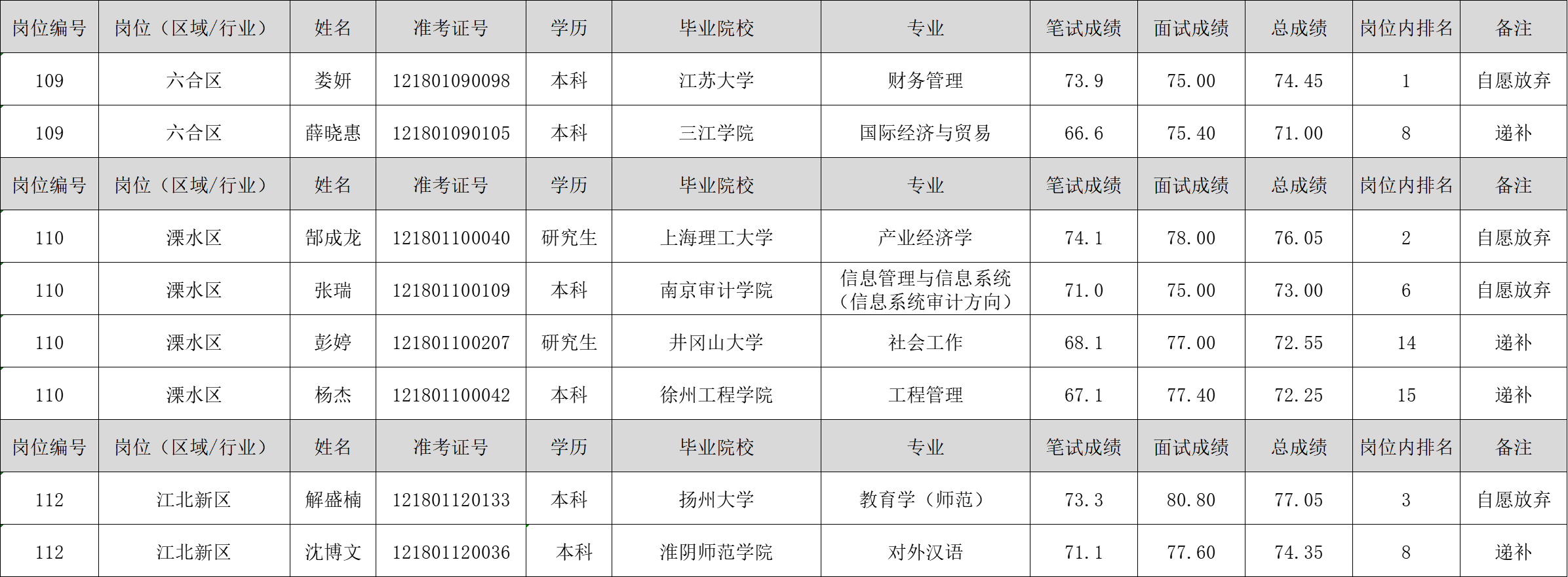 南京市社會化工會工作者招聘擬錄用人員名單已于2023年2月10日進行公示,公示后有部分考生自愿放棄錄用資格,根據招聘公告有關規定,在報考同崗位的考生中按總成績從高分到低分的順序遞補,遞補人員經體檢、考察等程序,現將南京市社會化工會工作者招聘放棄及擬錄用遞補人員名單予以公示: